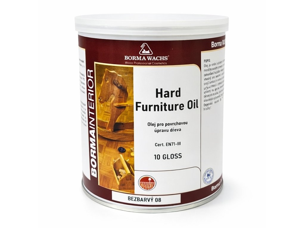 HARD FURNITURE OIL je olej na dřevo obsahující směsi vzácných jemných přírodních olejů a živic, obohacených o včelí vosk a karnaubu. Vyniká svojí tvrdostí a vynikající odolností vůči vodě. Je určený na úpravu interiérového nábytku, dveří, polic, židlí, stolů, dětských hraček, dřevěné obložení stěn a stropů a dalších dřevěných předmětů. Nábytkový olej je vhodný na tvrdé i měkké dřevo. Olej je určen pouze pro vnitřní použití.