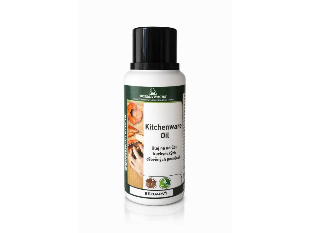 Olej na dřevo bez VOC; vyrobený z látek, které mají přírodní povahu a které jsou ideální pro ošetření dřeva surového nebo dřeva, které již bylo ošetřeno olejem, a které má být v neustálém kontaktu s potravinami, jako jsou kuchyňské stolové desky, salátové mísy, kuchyňské dřevěné prkýnka a další dřevěné kuchyňské pomůcky. Olej dělá povrch kuchyňských potřeb vysoce odolný vodě a nečistotám.